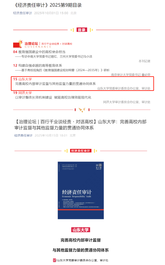 我校审计处撰写的《完善高校内部审计监督与其他监督力量的贯通协同体系》一文,立足新时代高校治理需求,从制度保障、计划统筹、执行联动、重点突破、数据赋能和整改闭环六个维度,构建了“制度-项目-执行-整改”全链条协同路径框架,并结合“政治引领、体制融合、科技赋能”实践案例,凝练政治优势、体制优势、科技优势三方面核心启示。该文的发表,不仅展示了我校在高校审计治理领域的研究成果与实践成效,也为高校健全监督体系提供了可借鉴的“山大经验”。
